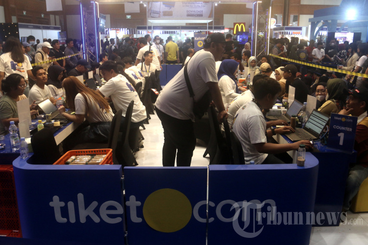 Pengunjung mecari info di booth tiket.com pada acara KAI Expo 2023 di Cendrawasih Hall JCC, Jakarta, Jumat (29/9/2023). tiket.com kembali berpartisipasi dalam KAI Expo 2023 yang digelar di Cendrawasih Hall, Jakarta Convention Center (JCC) mulai tanggal 29 September - 1 Oktober 2023 dengan memberikan penawaran spesial untuk tiket kereta api dengan harga terjangkau mulai dari Rp50 ribu untuk kelas ekonomi, untuk kelas bisnis mulai dari Rp100 ribu serta kelas eksekutif mulai dari Rp100 ribu hingga mulai dari Rp300 ribu untuk kelas luxury ke berbagai kota di Indonesia, seperti Semarang, Surabaya, Yogyakarta, Solo, Malang, Bandung, serta dapatkan grand prize berupa paket wisata tiket kereta dan hotel, dan gift voucher hingga Rp200 ribu. TRIBUNNEWS/IRWAN RISMAWAN