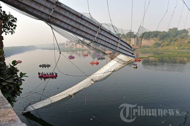 Personel penyelamat melakukan operasi pencarian setelah sebuah jembatan di seberang sungai Machchhu runtuh di Morbi di negara bagian Gujarat India pada 31 Oktober 2022. - Sedikitnya 130 orang tewas di India setelah jembatan penyeberangan era kolonial runtuh, membuat puluhan orang jatuh ke sungai di bawah, kata polisi pada 31 Oktober.