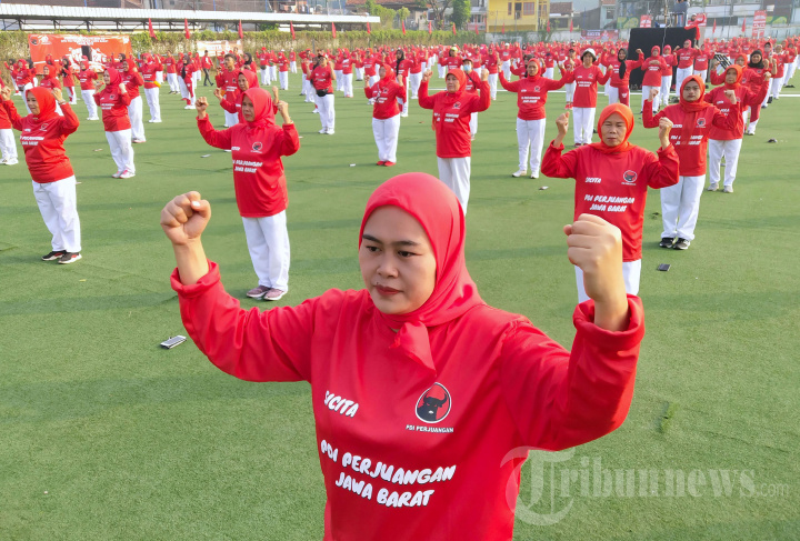 Sejumlah peserta mengikuti Senam Sicita (Senam Indonesia Cinta Tanah Air) yang dilakukan serentak di seluruh Indonesia, dalam rangka menyambut Hari Kebangkitan Nasional (Harkitnas), di Lapangan Hoki Cikutra, Kota Bandung, Jawa Barat, Jumat (20/5/2022). Senam yang melibatkan ratusan ribu kader dan simpatisan PDI Perjuangan (PDIP) serta masyarakat ini akan dicatat dalam Museum Rekor Indonesia (Muri) sebagai senam terbanyak yang dilaksanakan secara serentak dengan metode hybrid di Tanah Air. TRIBUN JABAR/GANI KURNIAWAN