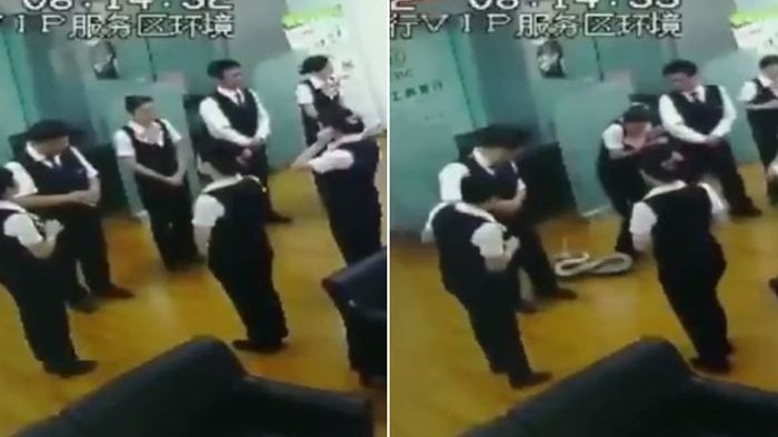 Para pegawai bank di kota Nanning, Tiongkok kejatuhan seekor ular piton berukuran besar saat sedang apel pagi.