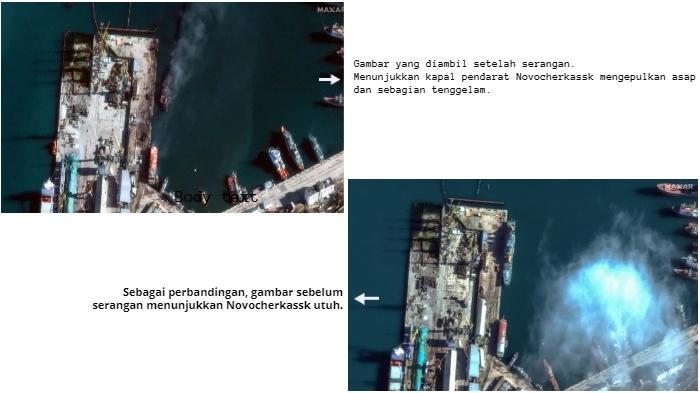 Gambar satelit dari Maxar Technologies menunjukkan kapal pendarat tank Rusia, Novocherkassk mengalami kerusakan parah setelah terkena serangan Ukraina