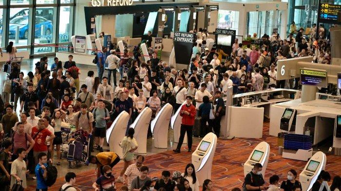 TRIBUNNEWS.COM - Antrean panjang terlihat di Bandara Changi, Singapura, Jumat (19/7/2024).