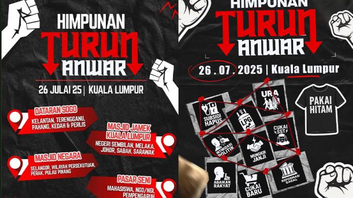 Aksi yang diklaim melibatkan gabungan partai oposisi seperti UMNO, PAS, dan kelompok mahasiswa ini akan digelar di Dataran Merdeka dengan tema "Malaysia Bangkit, Anwar Turun".