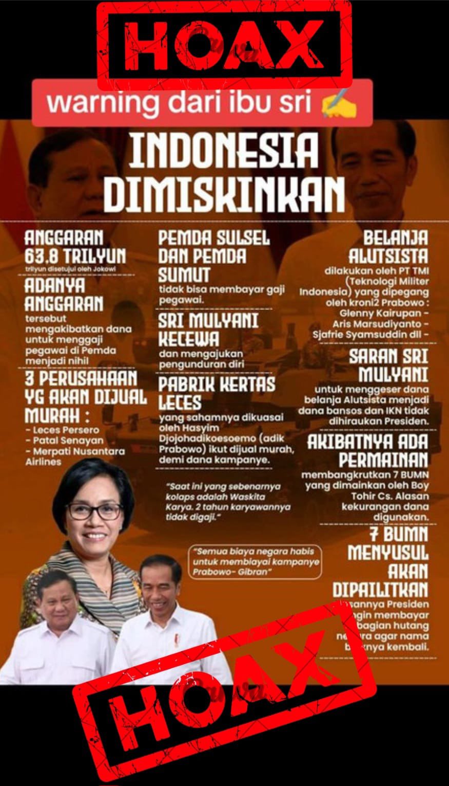 "Beredar poster ini. Kami pastikan HOAX. Menteri Keuangan Sri Mulyani tidak pernah mengatakan ini. Silakan bersaing secara sehat. STOP membuat konten dan narasi yang menyesatkan. Ini rawan mengadu domba dan menyulut kegaduhan, alih2 memikat hati rakyat," tulis Prastowo di akun medsosnya.