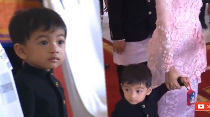 Jan Ethes yang mengenakan Teluk Belanga seperti Gibran terlihat sempat kebingungan dan berbalik arah ke ibunya.