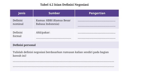 Siswa diminta menuliskan definisi negosiasi pada tabel di halaman 128.