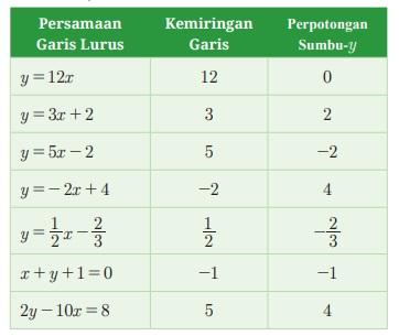 3. Tentukan kemiringan garis dan perpotongan pada sumbu-y untuk setiap garis lurus pada tabel di bawah ini.