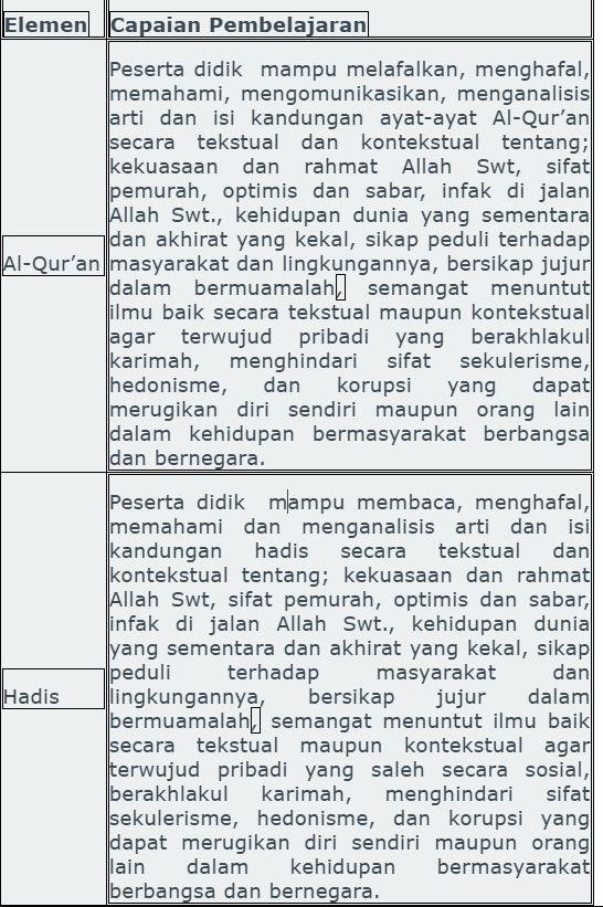 6. Capaian pembelajaran (CP) per fase dirumuskan dalam dua bentuk, yaitu capaian pembelajaran secara keseluruhan (umum) dalam lingkup satu fase dan capaian pembelajaran per fase untuk setiap elemen. Oleh karena itu, penting untuk pendidik memahami rumusan capaian pembelajaran untuk mata pelajaran yang diampu secara menyeluruh. Rumusan capaian per fase untuk mata pelajaran PAI pada madrasah terdiri dari unsur sebagai berikut
