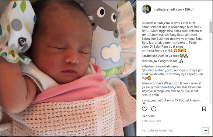 "Alhamdulillah Baby Ratu lahir hari Sabtu jam 8.20 mnt doanya ya smoga Baby Ratu jadi anak pinter n sholeha ...," tulis Melinda.