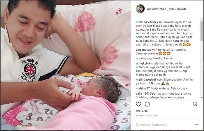 "Makasih ayah sdh Jd ayah yg luar biasa buat baby Ratu n ayah nungguin Baby Ratu sampai lahir n kasih semangat juga kekuatan buat ibu..," tambah Melinda.