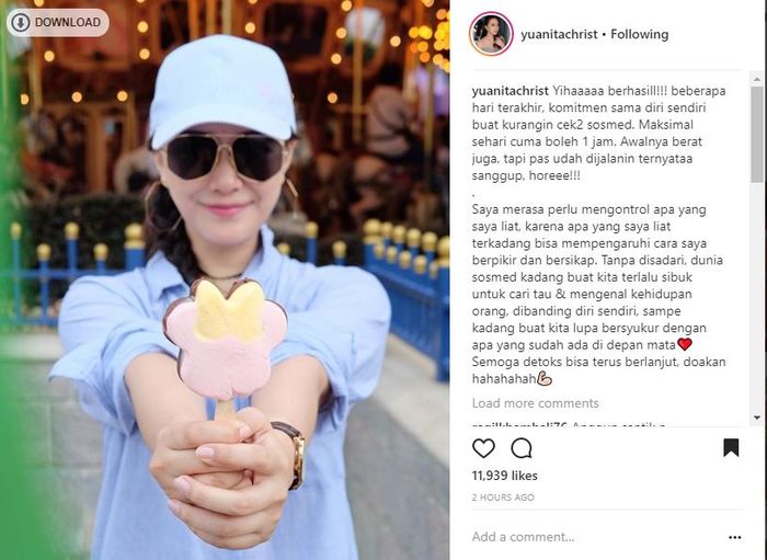 Hal tersebut ia ungkapkan melalui akun Instagram @yuanitachrist, Selasa (26/6/2018). Dalam sehari, ia hanya aktif pantau akun media sosialnya selama satu jam.