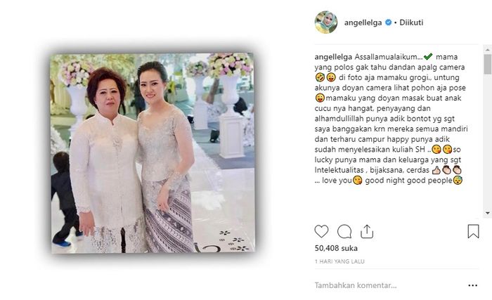 Selain itu, Angel juga bersyukur punya adik bungsu yang sangat membanggakan. Adiknya tersebut telah berhasil meraih gelar sarjana hukum dan menjadi seseorang yang mandiri.