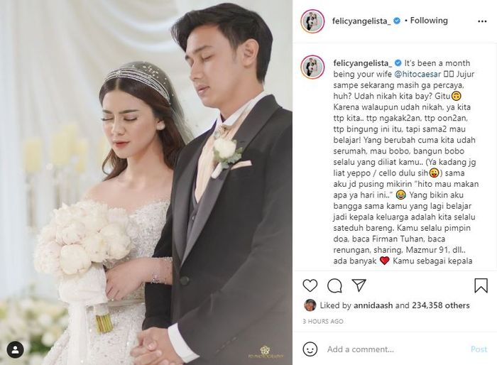 Pada postingan tersebut, Feli mengunggah foto momen pernikahannya bersama Hito.