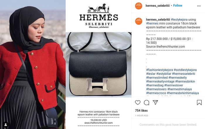 Tas hitam dari brand Hermes itu seharga 15 ribu dollar atau senilai Rp 217 juta atau seharga mobil merek Avanza.