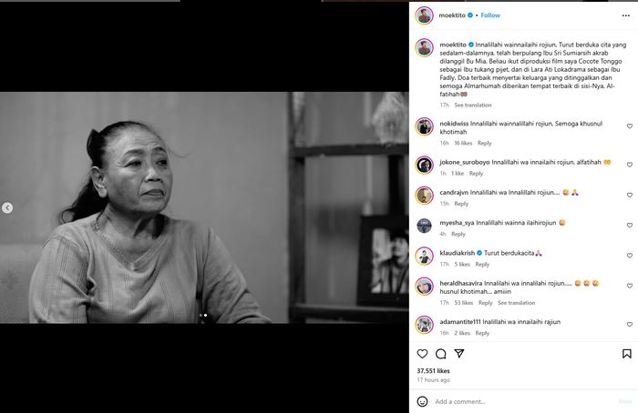 "Doa terbaik menyertai keluarga yang ditinggalkan dan semoga Almarhumah diberikan tempat terbaik di sisi-Nya, Al-fatihah," tulisnya di caption unggahan."