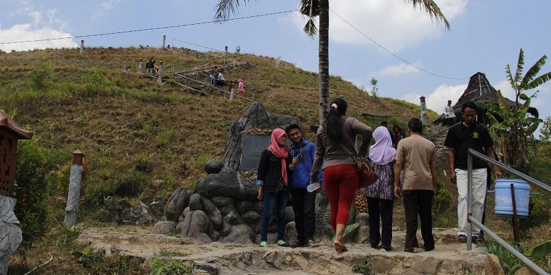 Dari atas bukit, kami bisa memandang hamparan perkebunan buah, gunung-gunung api purba, dan juga kaki embung yang dipenuhi oleh ratusan wisatawan.